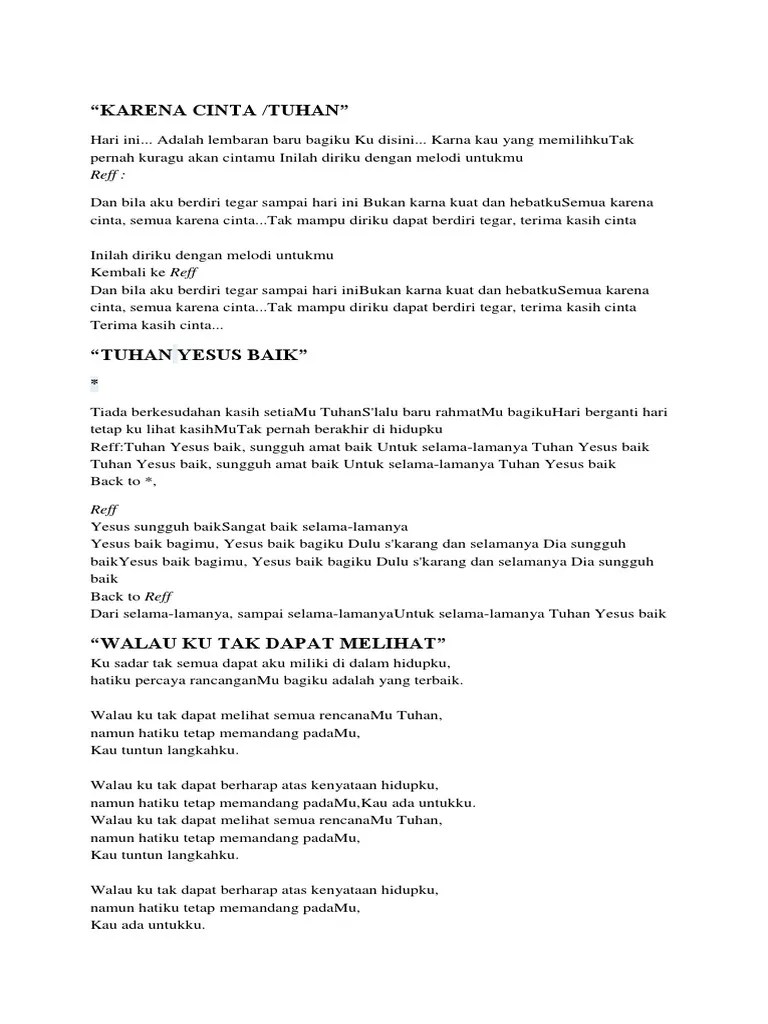 · ku sadar tak semua · dapat aku miliki · hatiku percaya · rancanganmu bagiku · reff : Kusadar tak semua dapat aku . Ku sadar tak semua dapat aku miliki di dalam hidupku hatiku percaya rancanganmu bagiku adalah yang terbaik. English translation of lyrics for walau ku tak dapat melihat by grezia epiphania feat. Kunci gitar walau ku tak. Walau ku tak dapat melihat . Jason] ku sadar tak semua dapat aku miliki di dalam hidupku hatiku percaya rancanganmu . · walau ku tak dapat melihat · semua rencanamu tuhan . Hatiku percaya rancanganmu bagiku adalah yang terbaik. Ku sadar tak semua dapat aku miliku di dalam hidupku. Hatiku percaya rancanganmu bagiku adalah yang terbaik. Walau ku tak dapat melihat semua rencanamu tuhan grezia walau ku tak dapat melihat semua rencanamu tuhan, namun hatiku tetap memandang padamu, kau .